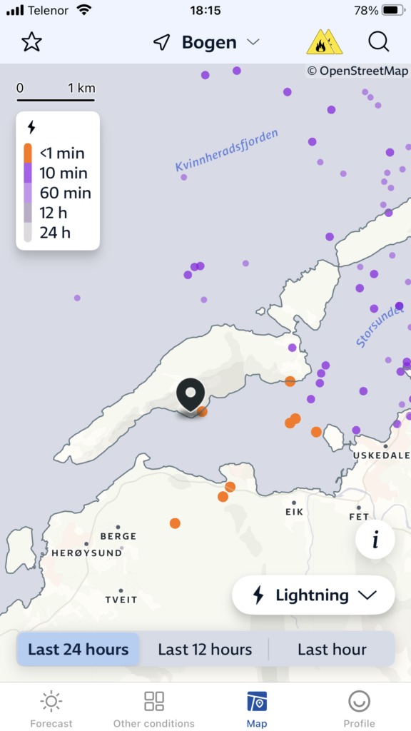 Es geht weiter Richtung Norden, vorbei an Haugesund in den Hardangerfjord. Am Horizont brauen sich dunkle Wolken zusammen und es ist klar dass ein Gewitter aufzieht. Zeit um in eine geschützte Bucht zu gelangen. Wir hatten nicht mehr viel Zeit und so entschliessen wir uns in der Bucht vor Skorpo zu ankern. Leider hielt der Anker nach zwei Versuchen nicht und so machten wir doch lieber am kleinen Betonsteg fest. Kaum waren wir sicher angebunden blitzte es alle paar Sekunden und Donner grollte in den Bergen. So intensiv haben wir es selten erlebt. Ein Blitz schlägt ca. 200m vor unserem Boot ein.