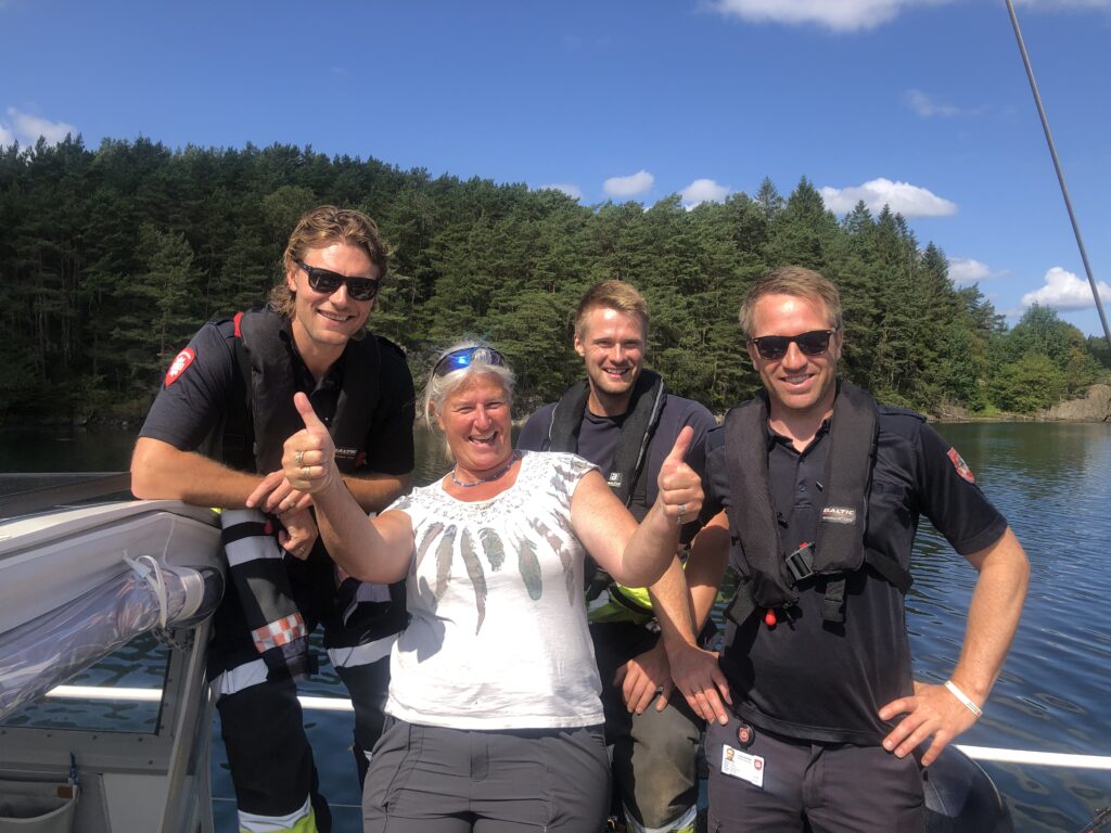 Die Feuerwehrmänner kommen also zu uns an Bord. Ich serviere Kaffee. Sichtlich angetan von der gemütlichen Atmosphäre geniessen sie ihren Sonntagsdienst bei schönstem Sommerwetter – auf einem Schweizer Segelboot im Fanafjord.