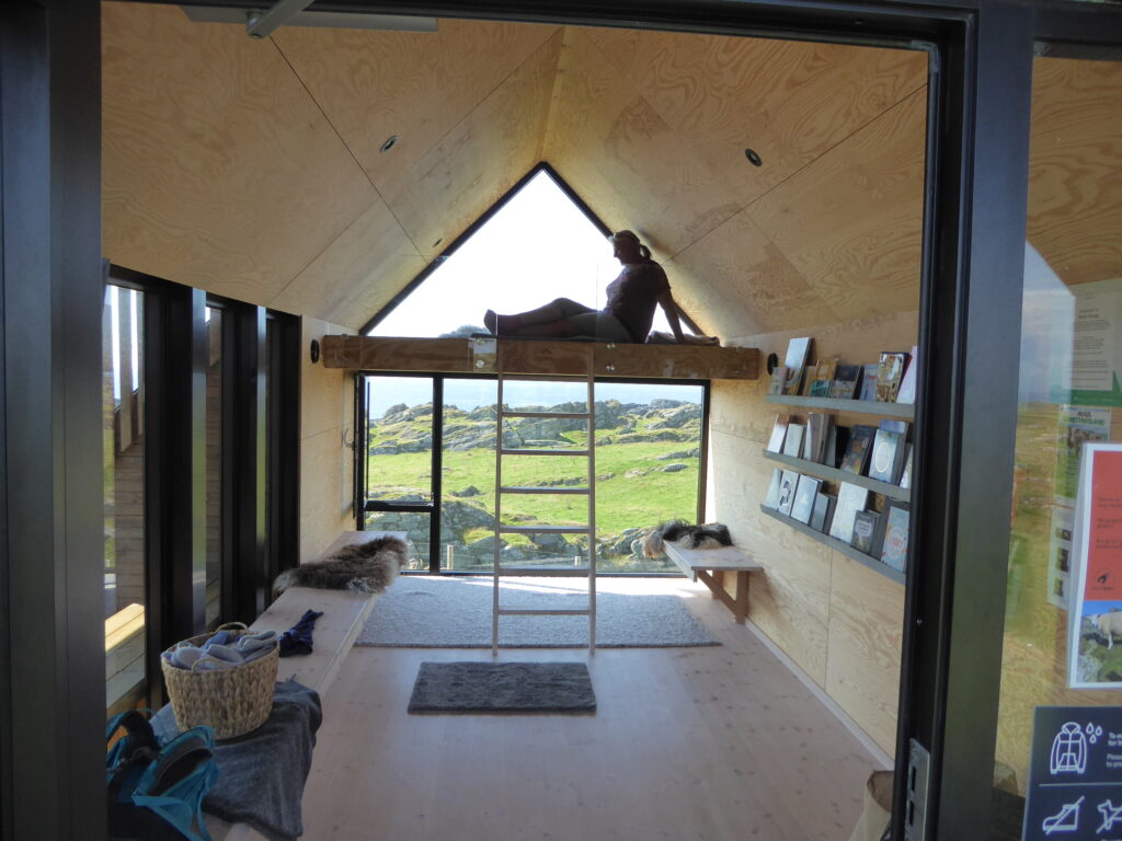 Eine kleine Wanderroute führt über die steinigen Hügel der Insel. In der Ferne entdecken wir eine Hütte mit grossen Fenstern und Martin sagt noch: das ist auch noch ein frecher „Siech“ der sich hier eine Hütte baut. Doch als wir näher kommen, sehen wir, dass die Hütte öffentlich und für alle zugänglich ist.