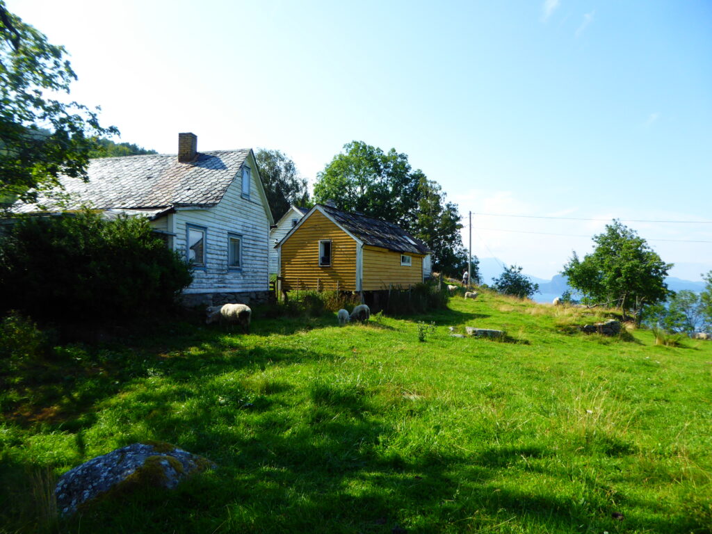 Kurz darauf kommen zwei Norweger zum Steg – offenbar neugierig wer da in ihrer kleinen Bucht festgemacht hat. Wir grüssen freundlich und fragen, ob es in Ordung sei, hier zu liegen. Ja natürlich, sagen sie – schon war das Eis gebrochen und wir lernten den Bauern, seine Bootswerft, die Kühe und Hafen kennen.