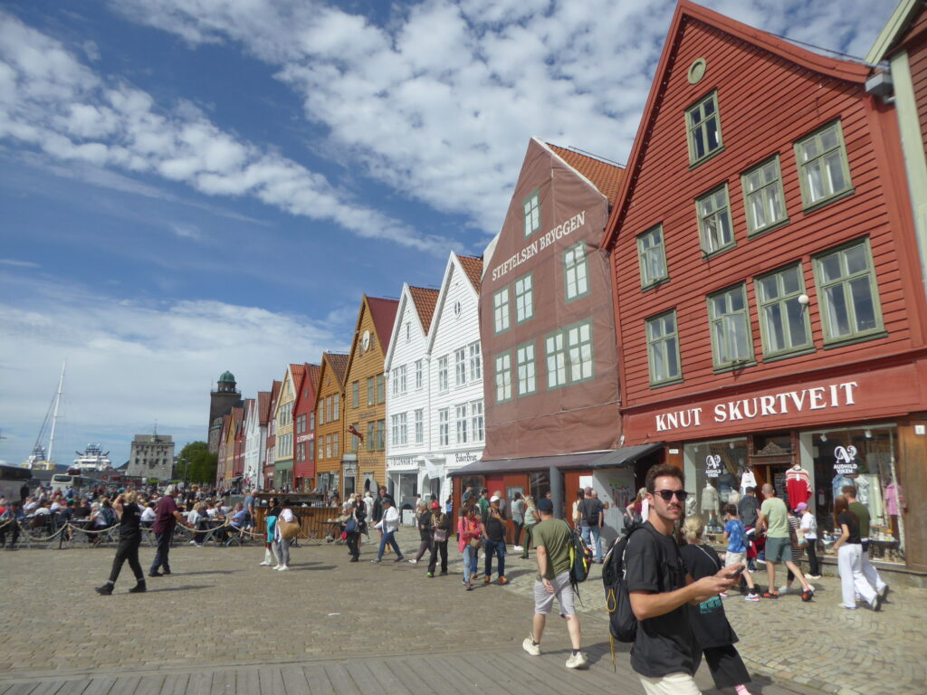 Am nächsten Tag – gesagt, getan – fahren wir mit dem Dinghi nach Bergen. Jeden Tag legen hier zwei bis drei Kreuzfahrtschiffe an, und das kleine Städtchen ist dann bis auf den letzten Winkel überlaufen. Trotzdem sind wir nicht alle Tage hier, also schlendern wir durch die überfüllten Gassen, weichen den Menschenmassen in alle Richtungen aus und lassen uns ein wenig treiben.
