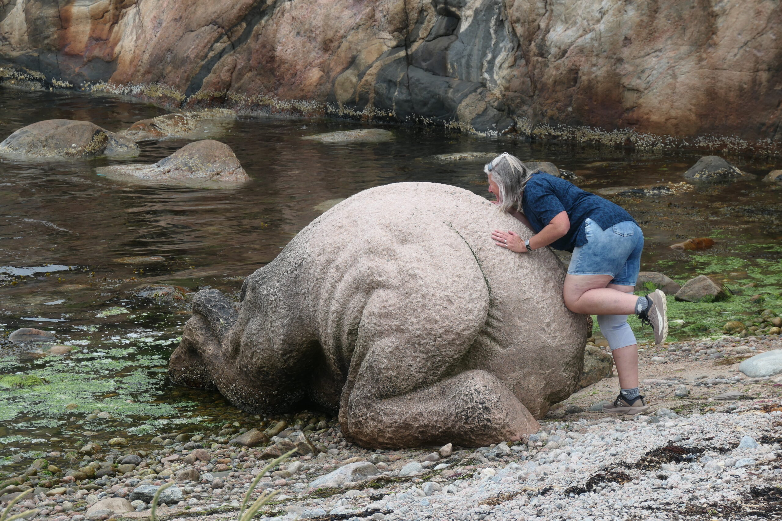 Eine kleine Wanderroute führt über die steinigen Hügel der Insel. In der Ferne entdecken wir eine Hütte mit grossen Fenstern und Martin sagt noch: das ist auch noch ein frecher „Siech“ der sich hier eine Hütte baut. Doch als wir näher kommen, sehen wir, dass die Hütte öffentlich und für alle zugänglich ist.