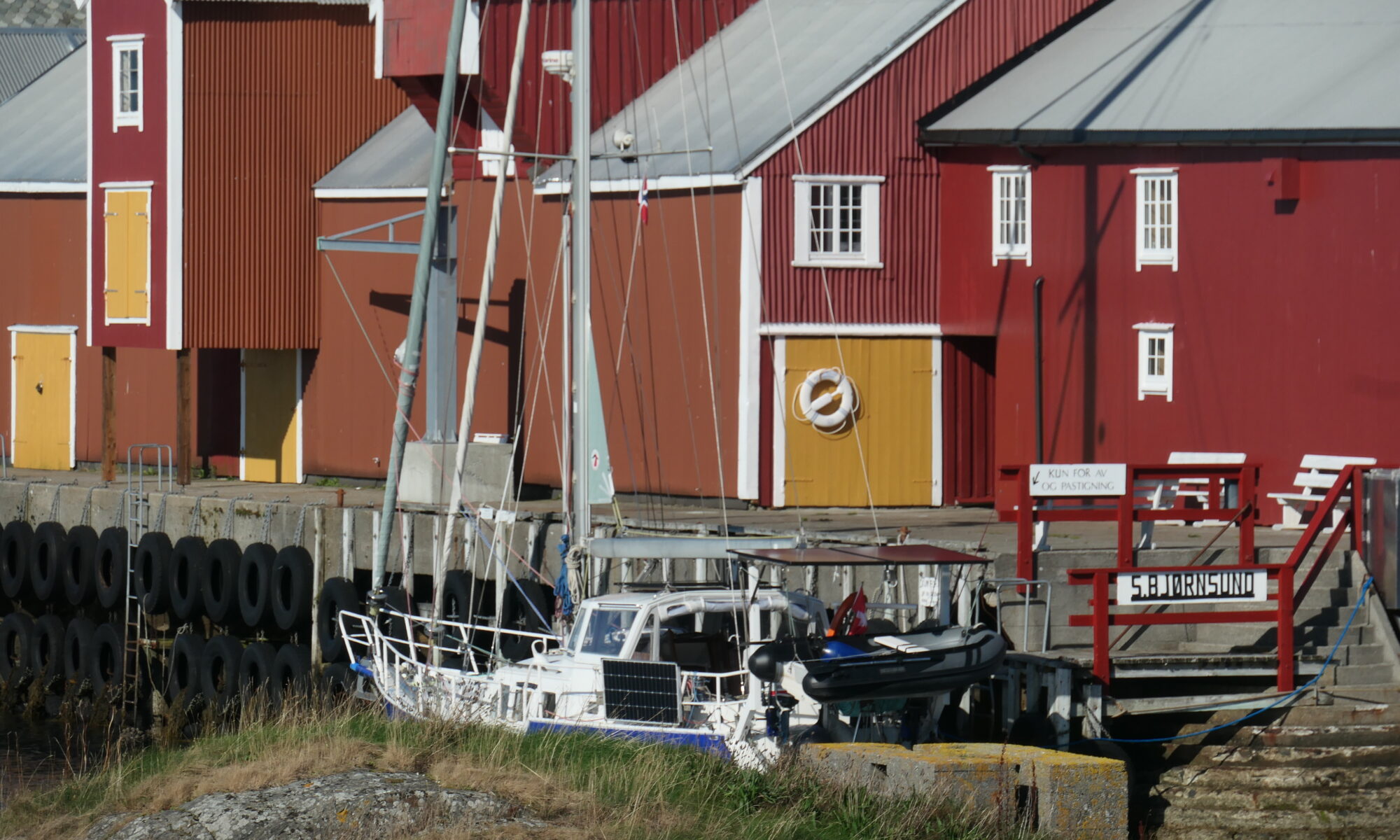 Glücklich und erleichtert das Kap umrundet zu haben, machen wir im Hafen von Kvamsøya an einem alten Fischersteg fest. Die Tide scheint hier doch etwas höher zu sein und so müssen wir über unser Dach und den schwarzen Reifen an Land klettern.
