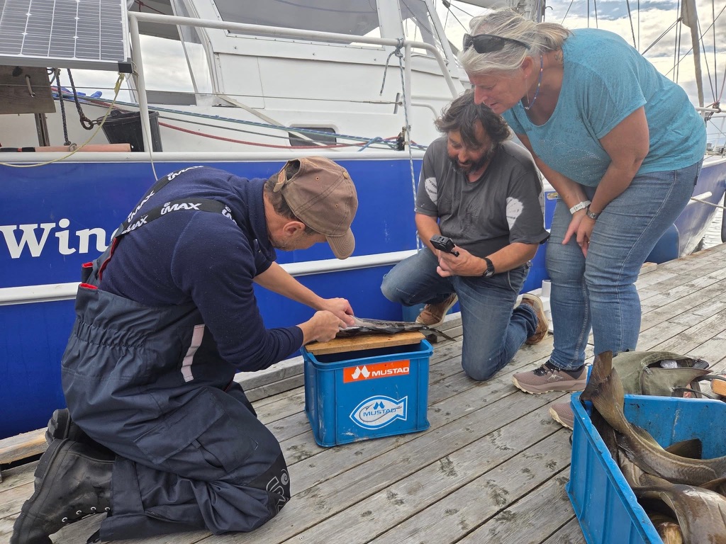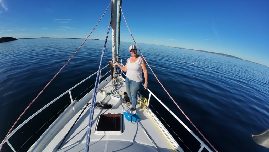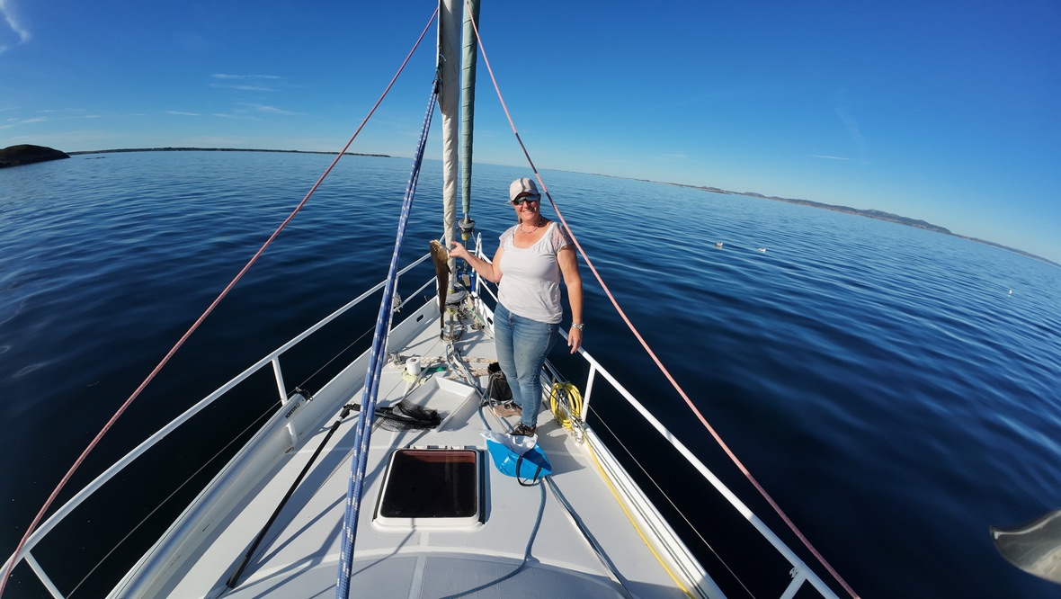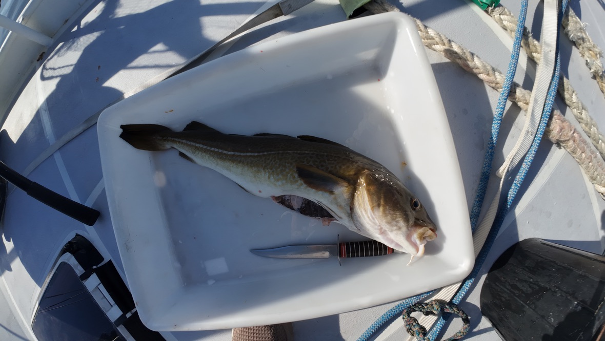 Am Steg treffen wir mittags auf Thomas und Tore – zwei Hobbyfischer aus der Nähe von Oslo. Sie hatten eine ganze Kiste voller Fische gefangen. Nach ein paar netten Worten bekamen wir von ihnen einen frisch gefangenen und filetierten Fisch geschenkt. Ausserdem wollten sie später noch auf einen Kaffee vorbeikommen.