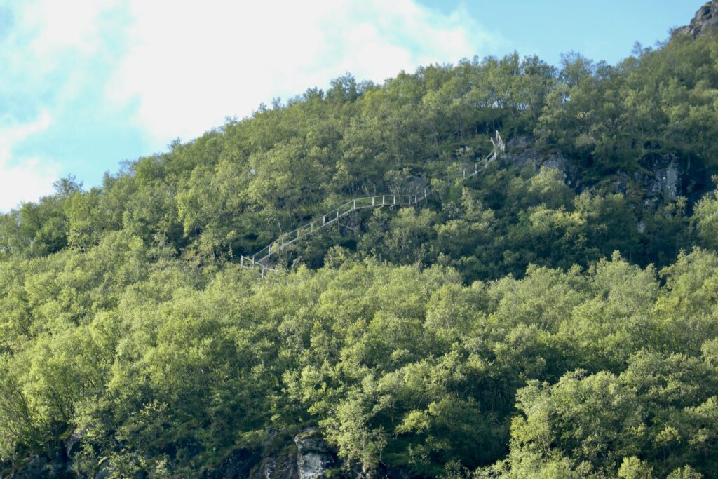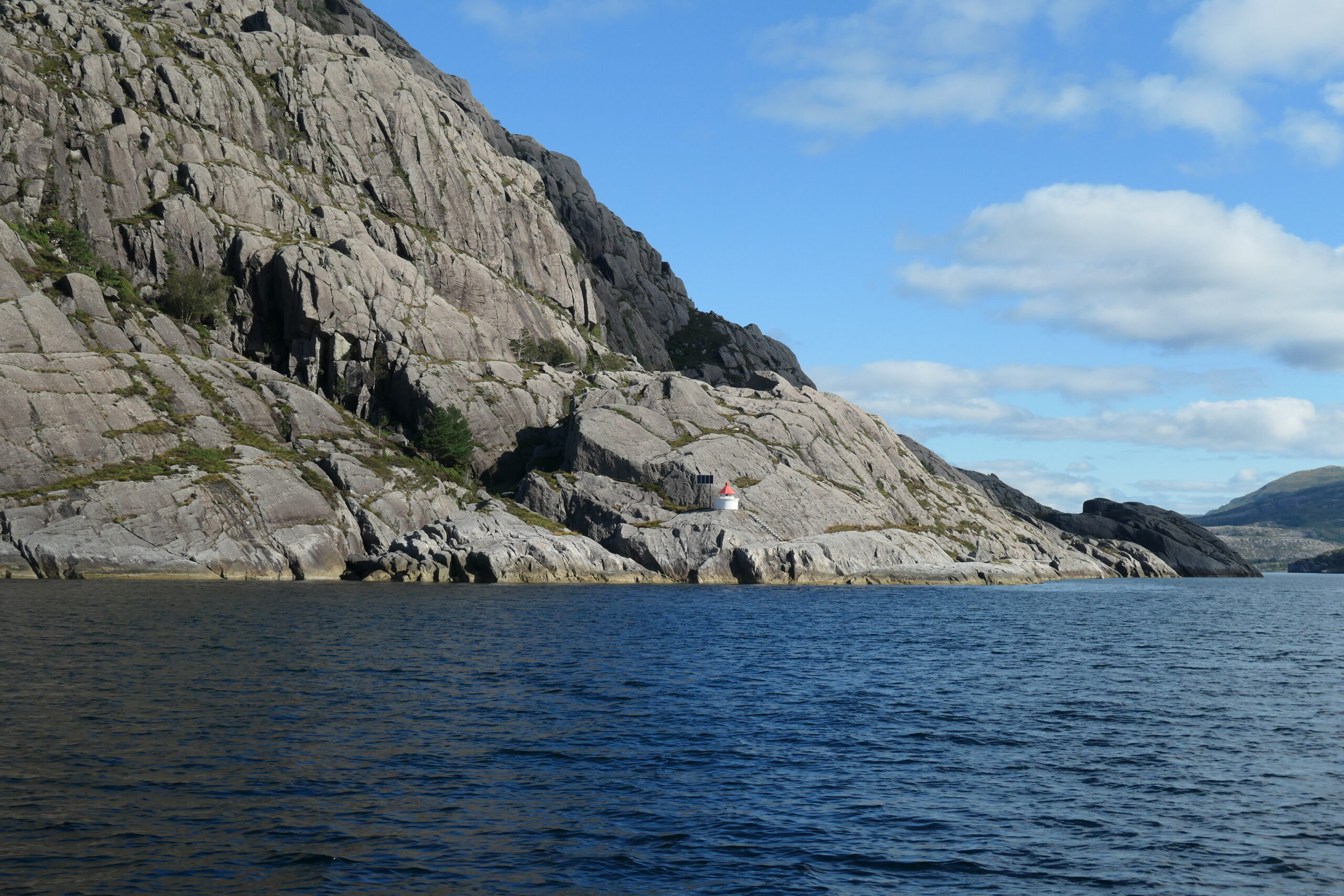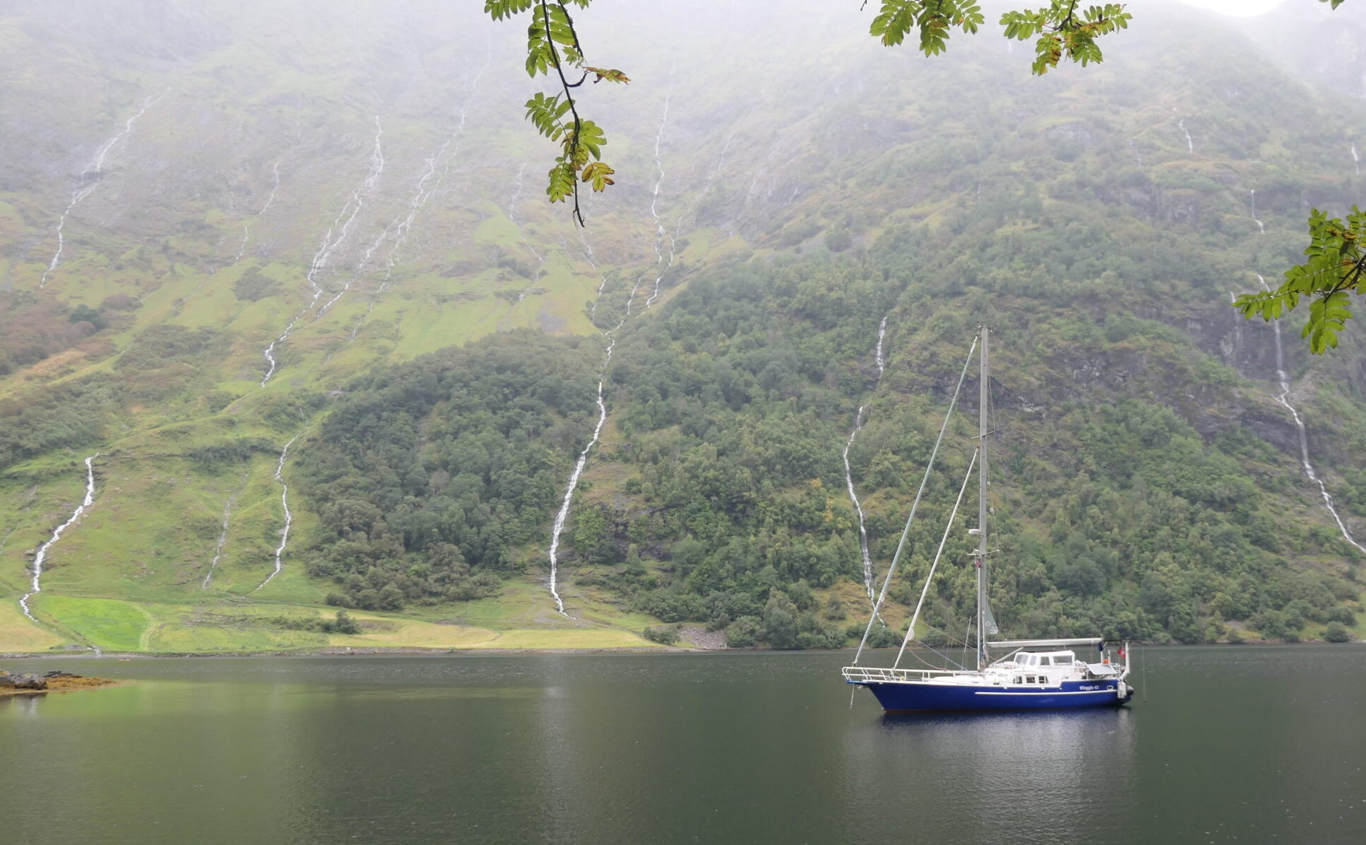 Am nächsten Tag planen wir, in einer Bucht gegenüber des Hornelen zu ankern, ca. 35sm weiter nördlich. Hornelen ist mit 860m die höchste Klippe Europas. Wiederum unter Motor geht es durch eindrucksvolle Felslandschaften, vorbei an steilen Hängen und grünen Tälern, die im Sonnenlicht fast unwirklich wirken.