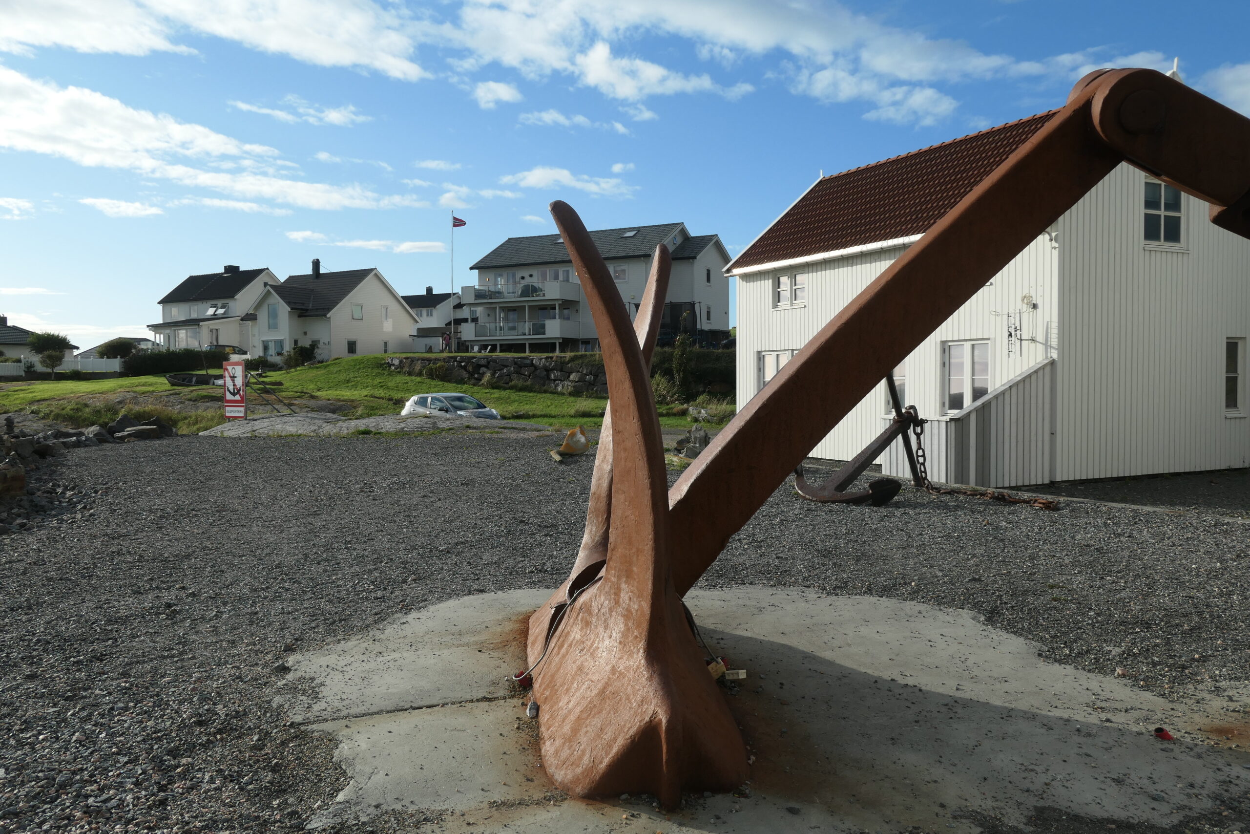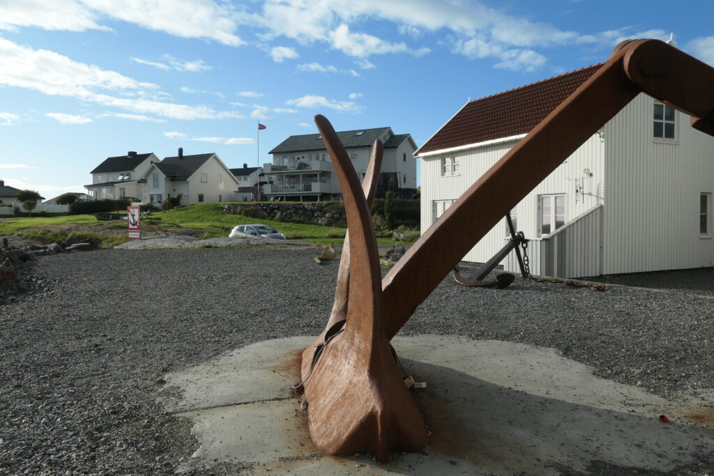 In zwei Tagen sollte das Wetter für den Küstenabschnitt Hustadvika ruhig sein und so legen wir im Hafen von Bud an um erstmal das Dörfchen zu erkunden. Hustadvika ist ein seichtes Meeresgebiet mit vielen kleinen Schären und Riffen. So manche Schiffsunglücke haben sich hier ereignet. Im Hafen liegt der verbogene Anker der Viking Sky – das Kreuzfahrtschiff ist 2019 vor der Küste in Seenot geraten. Sehr eindrücklich diesen massiven riesigen Anker vor uns zu sehen der einfach verbogen ist.