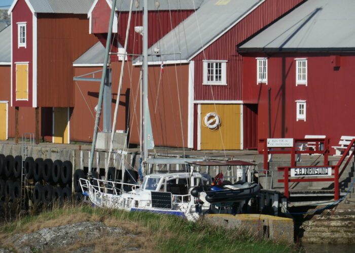 Glücklich und erleichtert das Kap umrundet zu haben, machen wir im Hafen von Kvamsøya an einem alten Fischersteg fest. Die Tide scheint hier doch etwas höher zu sein und so müssen wir über unser Dach und den schwarzen Reifen an Land klettern.